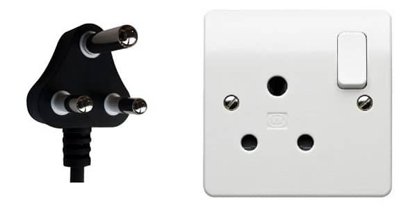 大南非插头几乎只在南非、斯威士兰和莱索托等国使用。它有三个呈三角形排列的圆插脚:其中较长、较粗的插脚是接地的,长28.6 mm、直径为8.7 mm;另外两个接火线和零线的插脚长18.6 mm、直径为7.1 mm,两个插脚的中心相距25.4 mm。大南非插头的额定电流为15 A,